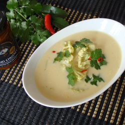 Bring the coconut cream, stock, Kaffir Lime Leaves, ginger, fish sauce and chutney to a gentle simmer. Add the Cauliflower and bring back to a simmer, cooking only until the Cauliflower is just tender. Take off the heat and add the chilli and the lemon juice.