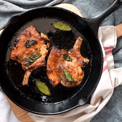 Remove pork chops from brine and pat dry. Place an oven proof pan on the stove at high heat. Add a tablespoon of cooking oil and sear the pork chops for 3 minutes per side until golden. Add a pat of butter and scatter with sage leaves. Brush the top with teaspoon Jenny’s Kitchen Tamarind Chutney and then place the pan in the oven for 6-10 minutes until cooked through (depending on thickness).